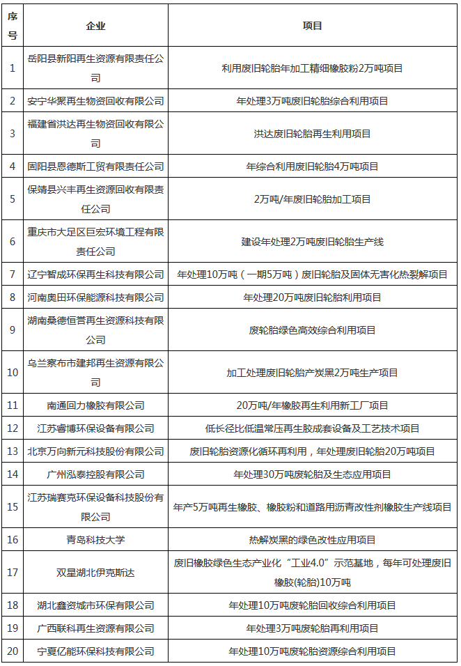 2019年废橡胶综合利用新上项目汇总表(截止10月)
