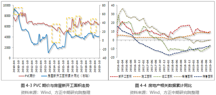通过对房屋新开工面积同比和PVC期价走势的追踪,可以发现两者之间存在某种相关性。回顾几个重要时间节点:2010年5月份,国内房屋新开工面积同比高达72.4%,当年11月份PVC期价创历史性新高;2014年10月份,房屋新开工面累计积同比达到小高点,到了2015年2月份PVC期价触底反弹,于5月份达到高点;2016年房地产异常火爆,4月份房屋新开工面积同比达到增长高峰,PVC期货价格在11月份上破8000关口,创近五年新高。2018年12月,房屋新开工面积同比创近几年新高,2019年5月PVC期货价格积极反弹,冲破7000关口。