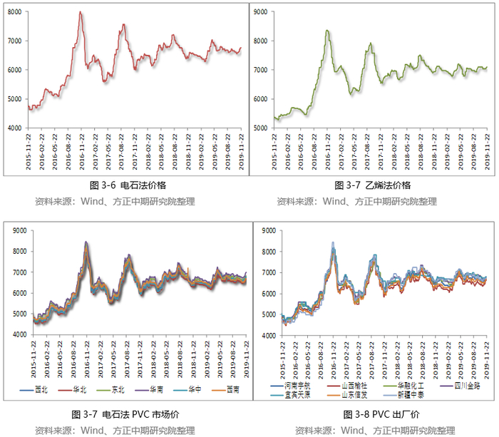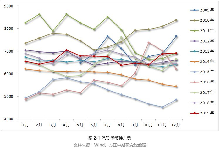 2016年底至2019年11月中旬,PVC整体呈现高位宽幅震荡走势,重心在6000-7500区间内波动。经过淘汰落后产能,PVC自身供需格局改善,处于紧平衡状态。VC价格高位运行,企业盈利水平好转。PVC市场运行好转,企业的扩产积极性增加,但受制于各种原因,真正投产的企业并不多,实际投产进度较为缓慢。由于PVC自身基本面偏强,在国内化工品中表现相对坚挺。PVC货源供应紧张状态持续时间较长,淡季不淡特征明显。