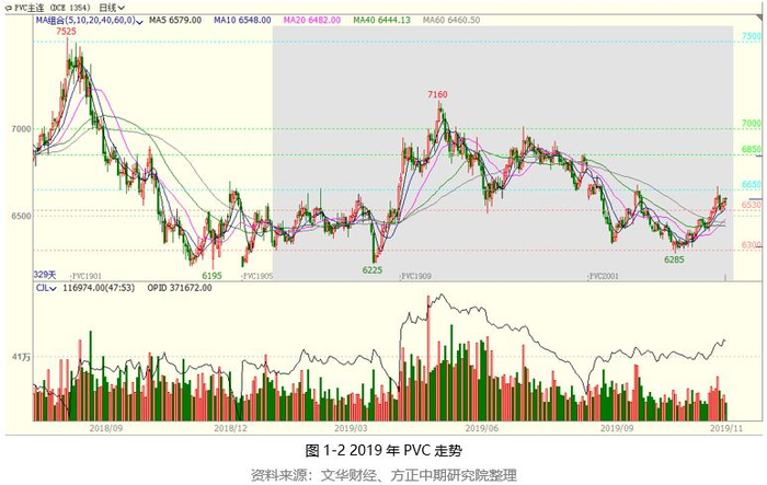 2019年PVC呈现高位震荡走势,波动幅度有所收窄,表现相对坚挺。5月份PVC冲高回落,回落至6300关口附近止跌,反复测试6300支撑位,但未能向下突破,企稳后重心积极拉升。现货市场货源持续紧张,现货价格深度升水,期货价格不断走高以修复基差。从技术走势看,PVC在2019年最后一个月或将维持涨势,有望冲击7000关口。2020年PVC走势略强于2019年,运行区间有望上移,预计价格波动范围6300-7500。