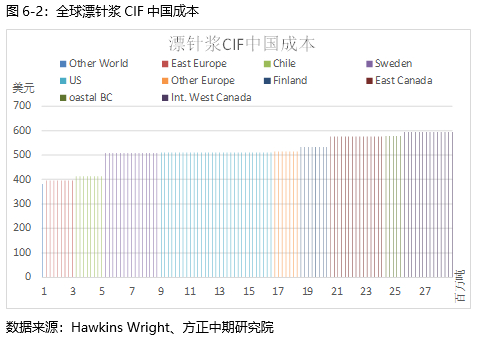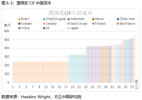 木浆生产成本主要有木材、化学原料、燃料,及人工、折旧、维修等固定成本,其中木材成本在总生产成本中占比50%,固定成本占比30%,化学原料和燃料占比在20%。