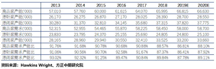 另外,全球仍有部分产能正在评估中,计划在2012-2025年启动,主要是以漂阔浆为主,最高可达到1180万吨,漂针浆计划产能270万吨,其余还包括少量溶解浆。但随着2019年全球木浆价格大幅下跌,预计启动时间会延后,对2020年全球木浆供给很难造成影响。
