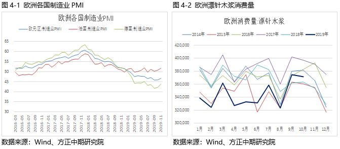 2019年海外市场需求低迷,欧元区制造业PMI跌破荣枯线,1-10月欧洲漂针浆消费量344.3万吨,同比减少7.4%。截止2019年10月欧洲港口木浆库存总量为187万吨,相比年初增加26.4万吨,同比增加40.7万吨。受到欧洲需求低迷影响,浆厂发运至中国占比增加,加剧后者供应压力。
