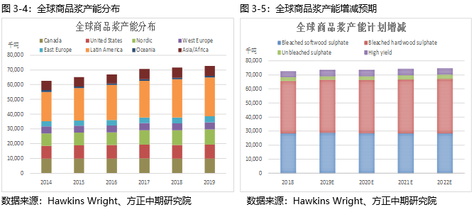 根据Hawkins Wright统计,2019年全球商品浆产能为7388.5万吨,同比增加108.5万吨,增幅1.5%。分地区看,北欧、东欧和拉丁美洲增量较大,分别为46万吨、35万吨和27.5万吨,亚洲(日本除外)和非洲产能减少16万吨,其余地区基本持平。分品种看,漂针浆产能2870万吨,占比39%,漂阔浆产能3782万吨,占比51%,本色浆产能263万吨,占比4%,机械浆产能445万吨,占比6%。漂针浆产能主要集中在北欧、美国和加拿大,以上三个地区占到漂针浆总产能的76%,漂阔浆产能则集中在拉丁美洲,占漂阔浆总产能的61%。2019年全球商品浆新增产能中,漂针浆和漂阔浆产能分别增加31万吨和50.5万吨,本色浆和高的率浆产能增加19.5万吨和7万吨,而漂针浆产能增量主要来自北方针,漂阔浆产能增量则来自漂桉浆。