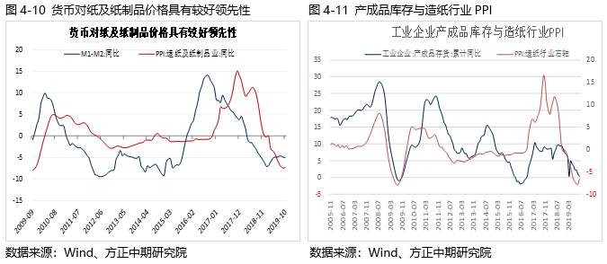 从库存周期角度分析,2019年开始国内制造业进入主动去库阶段,2019年9月产成品库存增速为0.4%,主动去库存进程持续,相比于最近三轮库存周期(200年6月-2009年8月、2009年11月-2012年11月、2013年9月-2016年8月),从2016年8月开始的此轮库存周期呈现出了梯形顶部的特征,顶部时间拉长,且在主动去库存过程中,出现了阶段性的库存回补(2019年4-5月),背后可能是此轮库存周期受到上游行业供给侧改革影响,同时拉动的因素转变为房地产投资,从而使库存一直在顶部震荡,拉长了被动补库的时间。从造纸行业看,成品纸价格在2017年6月到2018年10月也是处于高位震荡阶段,被动补库持续。当前库存已经接近于历史经验底部。从工业生产的量价关系来看,当前处在产量已大致见底、价格仍在寻底的阶段,根据库存周期规律,产量大致同步于需求,价格略微领先于库存,2020年一季度库存周期可能由主动去库存切换到被动去库存,之后进入主动补库阶段。