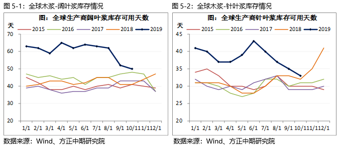 2018年四季度起,全球商品浆库存开始快速累积,进入2019年,库存一直位于高位,供给在上半年并未减少及需求转弱,加剧了累库压力,对于生产商和贸易商而言,主动去库存成为全年的主要基调,导致浆价持续下跌。PPPC统计,2019年10月全球生产商针叶木浆库存天数为33天,相比年初减少8天,同比增加1天,阔叶木浆库存天数50天,年初为63天,下降13天,同比增加9天,木浆库存总量同比增加5天。主要生产商看,金鱼在2019年三季度木浆库存总量减少了45万吨,主要是源自以价换量及产量下降。国内港口木浆库存降幅并不明显,根据卓创资讯统计,国内主要港口库存持续下降,截止2019年11月青岛港和常熟港库存总量168万吨,同比增加24万吨,增幅17%,相比年初90%的增幅明显下降。从全球生产商及贸易商和纸厂库存看,去库效果比较显著,各环节库存压力减小,总库存接近2016-2017年,若终端需求能够延续,则商品浆市场有望结束主动去库存阶段。