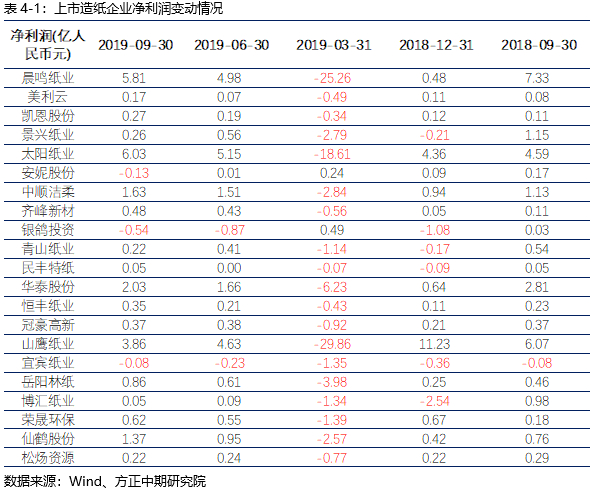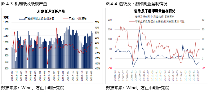2019年中国造纸行业景气度继续下行,1-10月行业利润总额累计506亿元,同比下降17%,为2013年以来最低值,造纸工业PPI连续10个月下降。纸厂预期偏弱,开工意愿较低,上半年以去库存为主,1-4月纸产量同比下降。进入三季度末后,情况有所好转,由于原料木浆价格大幅下跌,及成品纸价格的反弹,行业利润开始回升,8-9月利润总额同比转正,上市造纸企业净利润普遍由2018年3季度的净亏损转为盈利,9-10月机制纸及纸板产量同比增幅达到28%和22%,1-10月机制纸及纸板总产量增至10,346万吨,同比增加3.3%,盈利好转及旺季需求增加刺激纸厂生产热情。