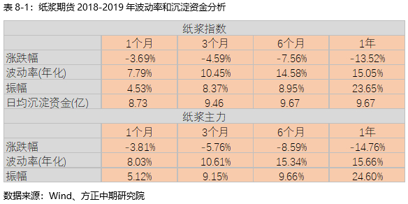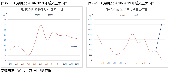 纸浆期货上市初期成交活跃度较高,主力合约日成交量最高达到160万手,成交额超过800亿元,而后快速回落,日成交量降至80万手以下,成交额减少50%至400亿元,随着盘面波动率降低,成交活跃度也逐步下降,在2019年6月和8月阶段性上升后,跌至上市以来的低点,日成交量在20万手左右,成交额在100亿元附近。持仓量逐步增加,上市初期持仓15-20万手,之后随成交量回落,不过进入下半年,纸浆期货持仓量逐步增加,整体稳定在20万手。持仓与成交量比值由0.5-1.0升至1.0-2.0,显示出纸浆投机度下降,但现货参与度提升。