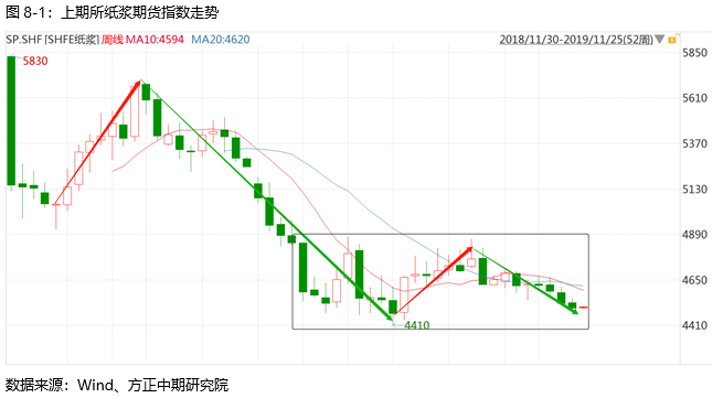 从大周期看,纸浆价格经历了一轮强势的5浪上涨,但2018年的第5浪因前期3浪运行时间较快、幅度较大,从而形成了透支,最终出现了衰竭的5浪。至此从2018年4季度,进入了A-B-C三浪的调整,截止到11月,C-5调整可能临近尾声。因此对于2020年,技术上看,存在上涨的基础,只是大幅下跌后,市场看涨动能衰竭,需要时间来重新积聚。