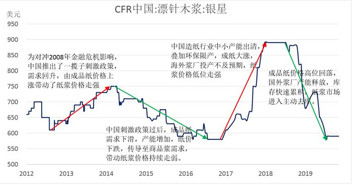 从长期看,纸浆价格整体走势与全球经济相关度较高,终端需求中生活用纸、文化用纸需求周期性弱于其他工业品,无论是2008年的大跌,还是2010年或2017年的大涨,背后均存在供给干扰,且价格“异常值”持续时间相对较短。2008年-2019年,主要分为以下几个阶段: