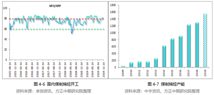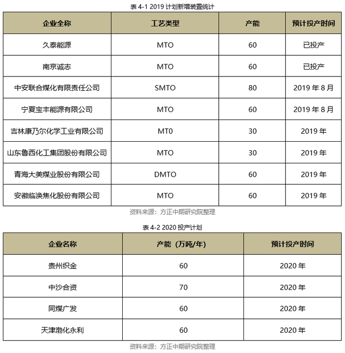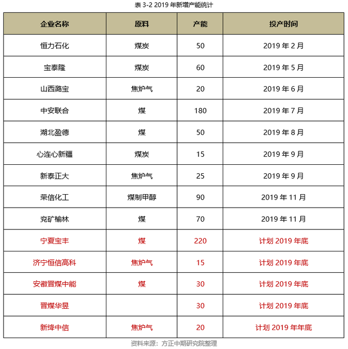 2019年烯烃产能重新步入快速扩张期,意向新增产能众多,计划新增产能达440万吨,内蒙古久泰、南京诚志二期、宁夏宝丰、鲁西化工等装置均有投产预期。其中,内蒙古久泰60万吨、南京诚志二期诚志60万吨产能已经在上半年顺利投产,宁夏宝丰60万吨及中安联合70万吨装置也在三季度投产,新增产能合计为260万吨,截至11月份,煤制烯烃产能达到1562万吨。仍有180万吨产能在计划投产中,如能按期投产,到2019年年底,国内煤制烯烃产能有望超过1700万吨。煤(甲醇)制烯烃行业仍是甲醇需求增长的主要驱动力,但2020年甲醇下游新投产速度将有所放缓。