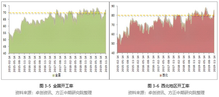 2019年甲醇行业开工率有所提升,截至11月中旬,国内甲醇整体装置开工负荷为72.14%,西北地区开工负荷为85.84%。甲醇装置运行负荷回升,尤其是西北主产区,市场货源供应稳步增加。截至11月中旬,甲醇全国平均开工率为69.45%,2018年同期水平为67.98%;西北地区平均开工率为81.08%,而2018年同期开工水平仅有75.79%。与2018相比,甲醇开工水平积极回升。甲醇生产装置一年一般存在两次集中检修,一是春季例行检修,二是装置入冬前检修。从甲醇的开工率可以看出来,3-5月份开工水平出现明显回落,而另外一次明显下滑是在8月份开始,时间节点有所提前。3月底4月初开始,企业陆续停车检修,开工率逐步走低,下滑至66.51%,但高于去年同期水平。5月份开始,装置检修接近尾声,甲醇开工率出现回升。多数西北厂家维持高负荷运行,最高达到88.68%,为近几年最高水平。
