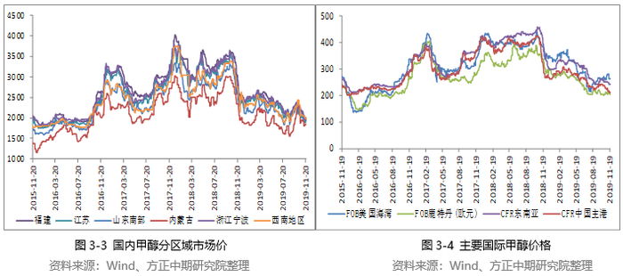 全球甲醇市场需求不济,外盘市场价格也陷入下跌趋势。从年初国际甲醇市场报价一路下行,欧美地区下跌幅度扩大。美国甲醇产量从2015开始逐步提升,欧美甲醇价格崩盘式下跌,并跌落至低于我国甲醇市场价格。受到美国对于委内瑞拉制裁等影响,原来固定去往美国跨洲套利的南美洲货源理性缩减,选择亚洲区域套利。全球甲醇市场供应充裕,压力不减。大量货源流入国内市场,进一步印证了全球甲醇供需关系的恶化。无论是欧美地区还是中东等主产区多地需求难有提升,但甲醇生产装置多运行稳定,国外工厂以及外商选择价格和需求相对稳固的区域套利,因此大量的转移货物来到中国等地区域。韩国和东南亚等地需求市场难有利好提振,曾有韩国货源转卖到中国。外盘甲醇具有价格优势,从而导致我国甲醇进口量积极提升。2020年随着伊朗和南美新装置的投产,甲醇供应将继续增加,需求提升难以抵消供应增量,全球甲醇仍有走低可能。