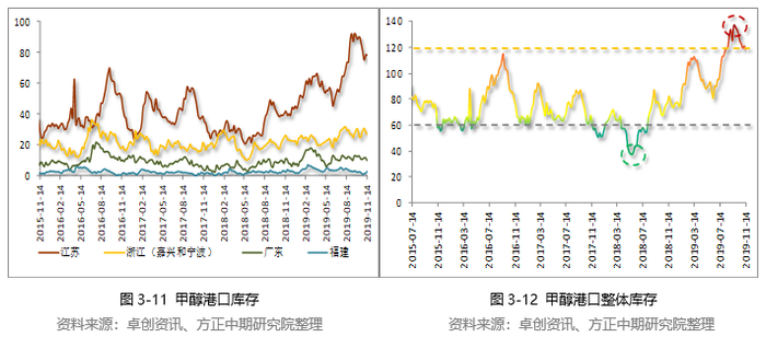 但去库存效果不理想,消耗速度缓慢,到6月中旬回落至80万吨水平附近,几乎处于2018年库存最高位。国内货源供应增加,进口货源的流入,甲醇港口库存止跌回升,持续累积。金九银十效应大打折扣,甲醇需求迟迟未能发力,港口库存超过130万吨。9月份最高上涨至137.16万吨,接近140万吨,甲醇港口库存创2015年以来新高。在传统需求旺季港口库存虽然有所回落,但仍在120万吨附近徘徊,港口库存处于偏高水平,大幅高于去年同期水平,压力依旧不减。从11下半月至12月初进口船货到港量在51.6万-52万吨附近,11月中下旬仍有1万吨进口船货去往北方区域套利。进口船货到港数量较多,甲醇进口居高不下,加之国内产量提升,库存难以快速下滑,压制甲醇走势。