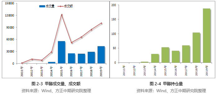 截至2019年12月初,甲醇期货成交量为43248.32万手,成交额为100501.85亿元,持仓量为187.49万手。2015年,甲醇成交量为55691.87万手,为上市交易以来最大成交规模。近几年,甲醇成交量变化不大,2019年出现明显增加。而甲醇持仓量则从2016年呈现稳步回升趋势,且增速加快。