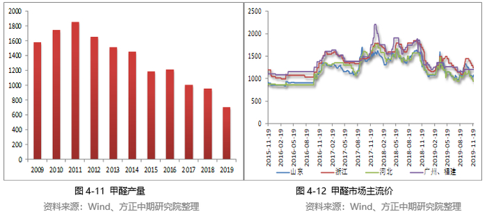 2019年甲醛行业保持供需两弱的状态,受到安检等因素影响,国内化工部分行业停车现象较为普遍,甲醛下游需求不佳。此外,甲醛生产装置检修现象较多,开工持续处于低位,货源供应也相应缩减,且行业内暂无新增产能。1-10月份,国内甲醛产量合计为708.79万吨,低于去年同期水平9.75%,产量下滑明显。在需求相对偏弱的环境下,虽然部分生产企业通过停车检修、降低负荷等减少供应量,但难以阻挡甲醛价格的下跌,企业盈利情况不佳。甲醛主要下游板厂、油漆行业开工率远不及预期,各地相继出台安全检查、环境保护政策,导致甲醛下游市场开工不足,需求端受到明显影响,甲醛生产厂家出货压力较大。甲醛市场供需关系有所恶化,行业环境整体偏弱,市场价格震荡走低。受秋冬季节环保压力的影响,山东南部、中北部地区以及河北文安地区下游板厂开工负荷大幅降低,甲醛需求量下滑明显。综合而言,甲醛市场重心逐步下移。2020年虽然企业无投产计划,但行业景气度不高,开工将延续低位,对甲醇消耗或有限。