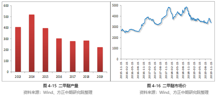 2019年二甲醚震荡走低,重心基本在3300-3800区间内波动,与去年相比价格明显回落。1-10月份,二甲醚产量为223.55万吨,与2018年同期相比窄幅回落4.25%。1-8月份二甲醚价格不断松动,需求端低迷,国内生产企业利润大幅缩减并出现亏损,企业排货压力较大。5月份开始,二甲醚步入需求淡季,价格进一步下滑。液化气市场持续低位盘整,气醚价差缩窄,终端掺混二甲醚积极性减弱,再加上城镇化进程及天然气进一步的普及,二甲醚需求面越发疲软。金九银十二甲醚借机发力,沙特遇袭加剧原油供应趋紧预期,国际油价强势反弹,扭转了二甲醚持续下行的局面。七十年大庆国家相关部门对于安全环保问题要求进一步升级,多数企业开工受限,市场货源供应快速收紧,二甲醚企业开工水平明显回落,为价格上涨带来了支撑。受到买涨不买跌心态的影响,下游终端开始纷纷备货,二甲醚价格稳步回升。但利空因素逐步充斥市场,玉皇、兰考汇通、义马开祥、山西金达及内蒙古盛德源货源不断投放市场,二甲醚市场供应表现过剩。二甲醚产业链条单一,气醚价差收窄引发下游观望,行业发展前景不乐观。
