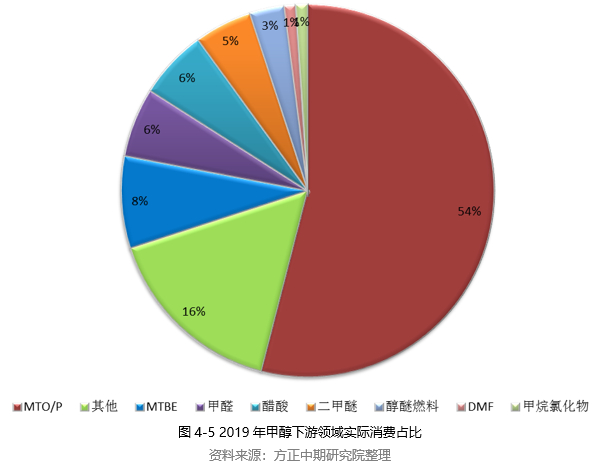 随着行业转型升级持续深入,甲醇下游市场消费结构也不断发生变化。近几年,我国甲醇及其下游格局变化主要受到国家政策以及高盈利刺激等方面的影响,尤其是大批MTO等装置陆续在西部地区新建及投产。煤制烯烃是在2011年才开始逐步成型,近几年对甲醇的需求增长速度惊人。2013年之前,甲醇行业下游消费多依赖于甲醛、二甲醚、醋酸等传统行业拉动。而2013年以后,在新兴下游迅猛发展、传统下游竞争趋弱双向作用下,国内煤制烯烃在甲醇下游消费结构中一举抢占首位。CTO/MTO对甲醇需求体量的增长作用明显大于其他下游,主要得益于CTO/MTO高于其他产品的单耗比例。自2014年起,甲醇新兴下游需求地位不断攀升,从而取代了2013年之前以甲醛为主的传统下游需求。2019年,煤制烯烃行业仍然占据甲醇下游消费首位,占比达到54%左右。MTBE、甲醛、醋酸和二甲醚在甲醇下游消费中占比有所减弱,醇醚燃料、甲烷氯化物等行业对甲醇消耗量较低。从下游发展情况来看,甲醇消费结构较去年变化不大,传统下游产品鲜有新项目投产,而甲醇制烯烃增长趋势也明显放缓。甲醇传统下游行业发展有限,产能扩张速度缓慢。新型下游MTP/MTO经历了2018年的集中投产后,2019年产能投放速度放缓。甲醇燃料是比较热门的话题,虽然在我国生产、应用有很好的基础,但在实际推广应用中还存在诸多问题。