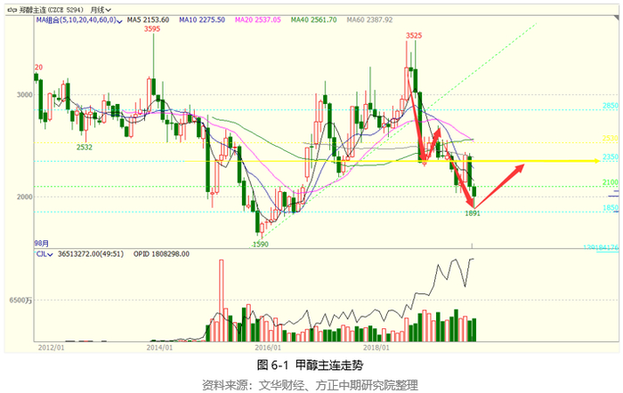 甲醇价格居高不下,导致下游企业生产成本压力较大,对高价存在抵触心理。随着冬季来临,受到环保政策的影响,传统需求开工受限。沿海地区部分装置停车或降负运行,甲醇消费大幅缩减,盘面应声回落,进入调整期。2018年10月中旬甲醇触顶回落,重心步步下移。终端需求疲弱态势显现,市场看空预期放大,甲醇依次跌破3200、3000、2650重要支撑,不断向下突破,重心回踩2350附近支撑短暂整理。2019年年关下游企业适量补货带动下,甲醇止跌有所回升。在装置春季例行检修预期下,甲醇期价窄幅走高,但上行压力明显,未能突破2700关口。检修力度明显减弱,同时下游需求迟迟未能恢复,甲醇供需结构转向宽松,期价再次步入下行通道。甲醇进口量超出市场预期,国内货源供应充裕,导致港口库存不断累积。宏观经济下行压力加大,同时贸易摩擦使得市场避险情绪升温,整体大环境偏空。2019年液体化工库存普遍处于高位,高库存压力下,甲醇期价无力回暖。需求淡季影响因素加快甲醇的调整速度,直逼2000整数关口。现货价格跟随期货走低,生产企业利润被大幅挤压,产业链利润向下游转移,厂家出货情况下调报价后未有明显改观。高供应、高进口以及高库存共同作用下,甲醇成功向下突破2000点,并进一步向下寻找支撑,创近三年新低。基本面不改善,甲醇难回头。
