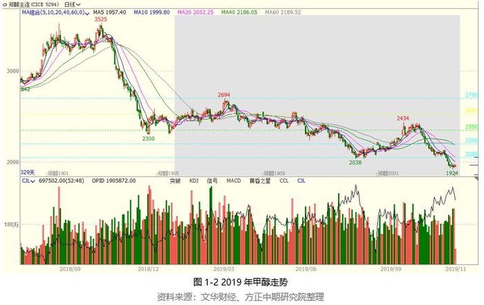 2019年甲醇期货运行区间明显下移,重心震荡走低,不断向下突破,跌破2000整数关口后进一步下探,并创近三年新低。国内经济下行压力加大,化工品尤其是液体化工表现普遍低迷,加之受到自身基本面的压制,甲醇跌势凶猛,重心基本在1850-2700区间内波动。国内甲醇现货市场价格不断松动,生产企业利润被挤压,产业链利润流向下游市场。甲醇生产装置运行平稳,开工率有所提升,产量增加,货源供应较为充裕。主产区企业库存水平偏高,报价逐步下调。2019年计划投产的装置依旧较多,已经投产的产能超过500万吨。且2020年新增产能不减,随着新增产能的释放,甲醇供应端压力突显。甲醇产能、产量同步提升,货源供给将维持宽松局面。尽管下游市场需求增加,但跟进速度较为滞缓。