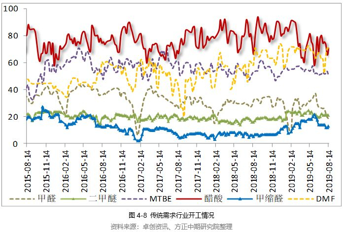 甲醇下游为甲醇制烯烃、醋酸、甲醛和二甲醚等工厂,虽然多数下游产品旺季多应该在每年的五、六月份和九月、十份,但近几年无论是原料甲醇还是下游产品多处于淡旺季淡化的阶段,即呈现淡季不淡、旺季不旺的状态,下游市场淡旺季区分愈加不明显。