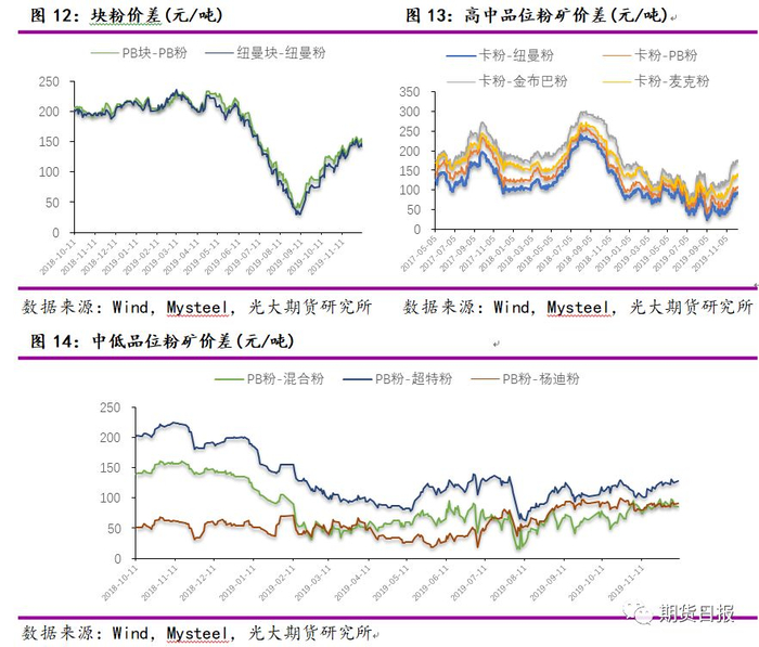 中低品位粉矿价差:2019年中低品位粉矿价差处于区间震荡的状态,其中PB粉—超特粉价差范围为80—120元/吨左右,考虑到后期钢厂利润水平下降及低品粉矿供给增加,预计2020年中低品粉矿价差处于收缩过程。