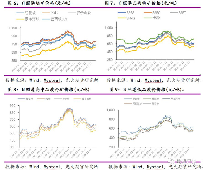 铁矿石现货价格走势和盘面相似。矿难发生后,现货价格持续上涨,在7月中旬达到年内高点。日照港卡粉高点值968元/吨、PB粉高点值906元/吨、超特粉高点值770元/吨。7月下旬,由于部分矿区复产,铁矿石供给缺口得到弥补,铁矿石供需矛盾转变,部分贸易商开始抛货,导致现货价格快速回落。从变化幅度来看,精粉、球团价格变化相对平稳,而中高品位粉矿价格变化幅度相对剧烈。