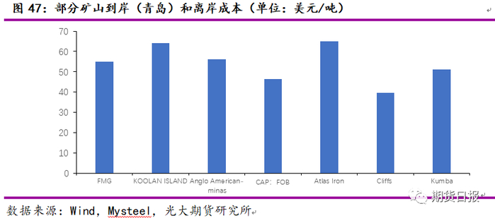 2019年,FMG到岸成本大约55美元/吨,KOOLAN ISLAND 到岸成本大约64美元/吨,Anglo American-minas到岸成本大约56美元/吨,Atlas Iron到岸成本大约65美元/吨,Kumba到岸成本大约51美元/吨。预计2020年铁矿石供需平衡成本在65—70美元/吨之间。