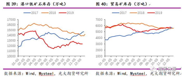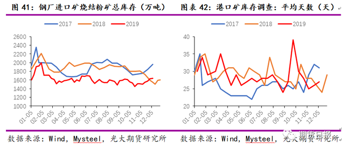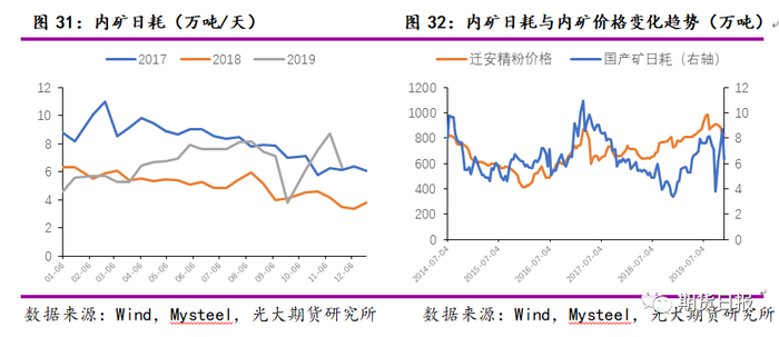 2019年内矿日耗水平呈现增加趋势,国内部分钢厂有自有矿山,在矿价较高时,内矿日耗增加,如图34所示,内矿价格与内矿日耗变化趋势有很好的一致性。