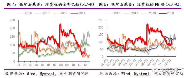 1905合约为主力合约时,铁矿石基差处于正常范围。8月初,当1909合约成为主力合约时,铁矿石基差偏大,以日照港金布巴粉为标的的铁矿石基差高点在225元/吨左右,后期逐渐回落。