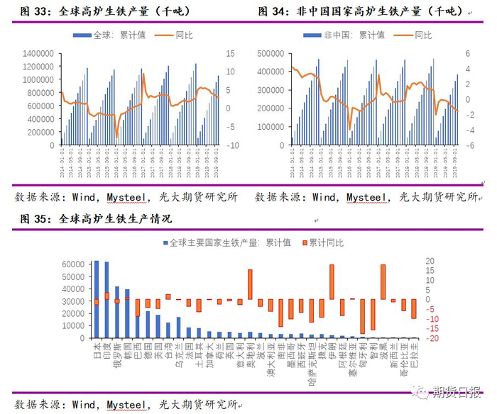 2019年1—10月,全球高炉生铁产量大约10.62亿吨,同比增加2.83%,增幅较去年减缓。2019年1—10月非中国国家高炉生铁产量3.85亿吨,同比下降1.55%。