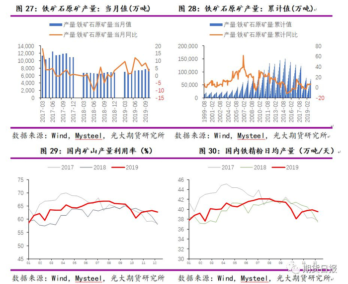 2019年1—10月,中国铁矿石原矿产量为7.12亿吨,同比增加6.5%。据Mysteel统计,2019年内矿(铁精粉)产量或达到2.69亿吨,较去年大约增加2200万吨,预计2020年内矿产量增加1100万吨产量,达到2.8亿吨。