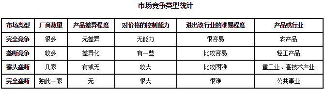 市场的竞争形态一般分为完全竞争市场、垄断竞争市场、寡头垄断市场和完全垄断市场。垄断竞争和寡头竞争也统称为不完全竞争市场,不同竞争形态下厂商的数量、产品的差异化程度、对价格的控制能力,进入行业的难易程度等都有较大的差别。