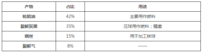 轮胎裂解是指将废轮胎或废橡胶通过热裂解生产轮胎油、裂解炭黑和不凝可燃气。轮胎裂解的产物及产出占比如下表所示: