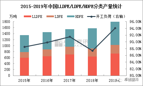 伴随着中国聚乙烯产能的不断扩大,近5年来聚乙烯产量呈现逐年递增趋势,2019年中国聚乙烯产量达到1793.61万吨,同比增加13.3%。2019年石化装置大修企业数量比2018年明显减少,开工负荷水平有所上升。