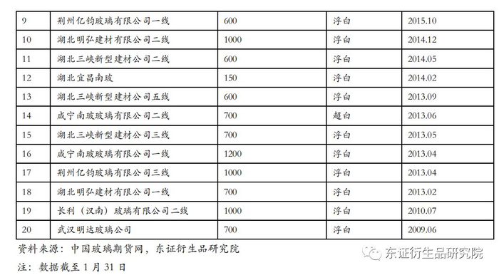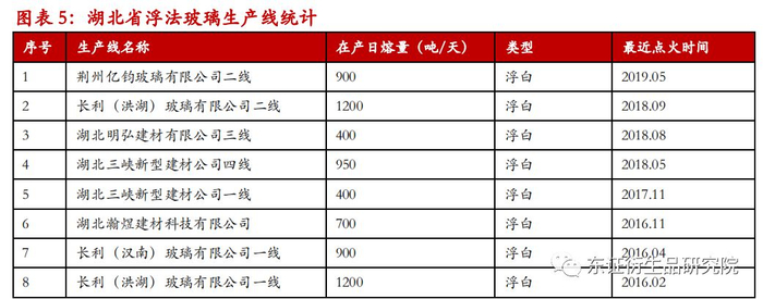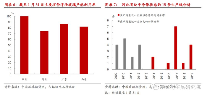 不同于沙河地区玻璃企业生产线条数多,单条产量小的特点,湖北地区玻璃生产线条数少但产量大,且普遍较新。截至1月31日行业未出现限产前,湖北省全部的浮法玻璃生产线有20条,无一冷修,全部在产,产能利用率达到100%。2019年全年湖北省仅有一条生产线(荆州亿钧二线)因窑炉窑龄到期在1月份放水冷修,并且在四个月后即点火复产。从生产线寿命看,湖北省20条生产线中有18条都是在2013年之后点火的,玻璃生产线持续运行的时间通常在8-10年,也就是说这些生产线还未到窑龄到期需要放水冷修的时候。其余两条生产线虽然窑龄已经比较长,但也一直在产,并且据我们了解,2020年也没有冷修计划。