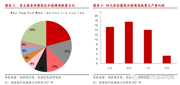虽然从各省份的建筑业玻璃消耗量来看,湖北地区在四大省份中的消耗量最大,且消耗量占本省产量的比例也最高,但这并不代表湖北当地对原片的消化能力强。由于玻璃原片必须要加工成各种深加工产品才能用于建筑业,因此对原片的消化能力要看当地的深加工行业。河北建筑业对玻璃消耗量非常少,在之前本地深加工产业未发展起来时,原片对外销的依赖度极高,随着近年来本地深加工率逐渐提升,这一状况才有所好转。而湖北虽然本地建筑业对玻璃消耗量相对较高,但由于深加工率不高,因此也很依赖外销,目前外运比例在50-55%。