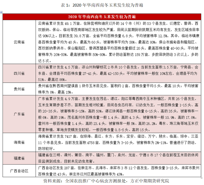 由于我国东北、华北、华中、华东地区玉米在二季度以后才开始种植。目前草地贪夜蛾是袭击冬玉米,即我国华南地区冬玉米。主要包括云南省、四川省、贵州省、广东省、海南省、福建省、广西自治区的冬玉米。