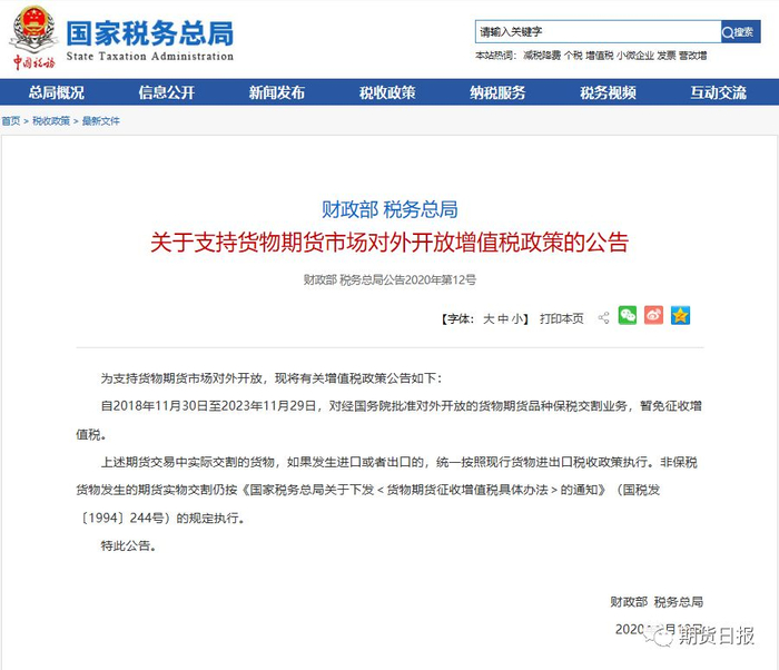 2月18日,为支持货物期货市场对外开放,财政部和税务总局联合发布了《关于支持货物期货市场对外开放增值税政策的公告》,公告称,自2018年11月30日至2023年11月29日,对经国务院批准对外开放的货物期货品种保税交割业务,暂免征收增值税。