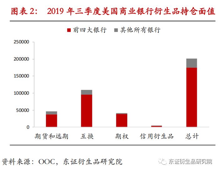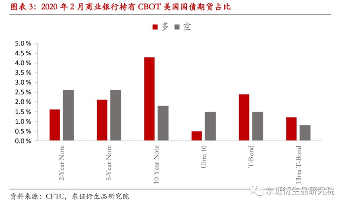 截止到2019年3季度,美国银行持有的利率衍生品面值高达147万亿美元。衍生品市场集中度非常高,前四大银行所持有的衍生品占全部银行持有衍生品的87.2%(见图表3)。但总的来说,商业银行在芝加哥期货交易所的几个国债期货品种上的持仓量占比并不高,2020年2月几个合约的持仓占比均未超过5%。
