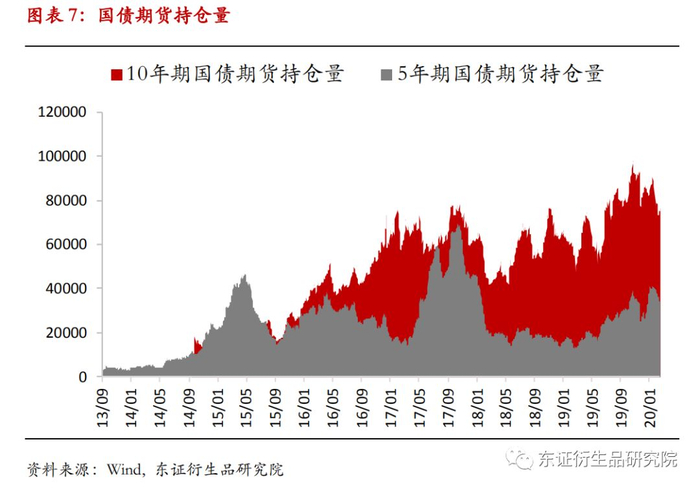 银行金融投资中的“以公允价值计量且其变动计入当期损益的金融投资”的科目直接受到利率波动的影响,利率上升导致债券价格下跌造成的损失将直接影响利润表。所以这一类投资的套期保值需求是最大的。通过测算,第一批试点的5大银行2019年三季报中披露的该科目投资总计约2.56万亿。目前国债期货市场三个品种持仓量面值累计在1400亿左右,虽然二者看似差距很大,但是银行不会进行完全套保。刚开放的试点银行是五大行,交易属性不强,以公允价值计量且其变动计入当期损益的金融投资占总的金融投资比例均值在9.6%, 大行的资金成本低,盈利模式对债券交易的依赖较低,预计开放后并不会蜂拥而入,造成市场剧烈震荡,短期内的小幅波动和情绪的影响是可能出现的。而且从市场的容量上来说,现在也是比较合适的时机,目前10年期国债期货持仓量处于历史高位,5年期国债期货持仓量也不低,对开放新的投资者入市具有一定承受能力。