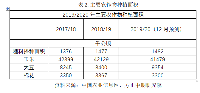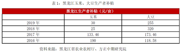 2018年由于外部环境发生变化,我国通过调整补贴政策调整,进而导致我国种植结构开始发生变化。2018年以来,黑龙江省大力推行大豆种植补贴,每亩达到320元,这使得大豆种植面积在2018年有了较大的增长。2019年黑龙江大豆种植补贴出现一定的下滑,每亩达到255元,目前玉米每亩补贴仅有30元/亩,这使得大部分农民和种田大户在农作物的选择上都会偏向于种植大豆,从而使得今年大豆种植面积进一步提升。