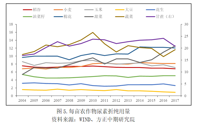 大豆根系有根瘤可以固氮,因此对氮肥需求量相对较低,而对磷肥和钾肥需求量相对较大,而玉米、水稻等主要农作物根系并不能固氮,因此氮肥需求量将大大超过大豆。根据WIND统计的数据,每亩大豆折合尿素使用量不足1千克,而相比之下,每亩玉米折合尿素使用量在7.13千克,每亩稻谷尿素使用量在6.81千克。