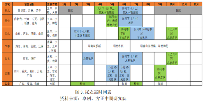 每年的1-2月份是我国农业用肥的淡季,而进入3月份农需用肥才真正开始增加。3月份小麦主产区进入春小麦返青用肥小旺季,3月下旬高氮复合肥生产开始进入生产旺季,最晚至5月底,南方局部地区有水稻用肥。6-7月玉米等大田作物进入全年最大的追肥旺季,自东北开始,基本在7月底全面结束。5-7月是全年尿素需求量最大的三个月份,每年这段时间尿素农需用肥占尿素全年农需用肥的40%。8月份尿素需求转淡,9-10月份,主要集中于安徽、河南等局部地区秋小麦备肥及用肥,其他地区用肥量偏弱。10月中旬之后,农需用肥基本结束。