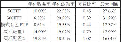 利用指数价差的特征,来灵活调整ETF配置,在特定时间,将股票ETF指数替换成有色指数ETF,可以有效提高资产的收益水平。从结果来看,从2016年至今,在特定时间段,将配置的50ETF或者300ETF和有色指数ETF进行轮动,资产的年化收益率分别达到14.99%和19.84%,并且资产的年化波动率和最大回撤仍然保持低位。