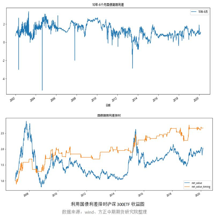长端利率的上行放缓甚至回落反映了对未来经济增速预期的降低,是市场对于一系列经济数据综合判断的结果,自然也就和未来的衰退相关,另外,曲线趋于扁平意味着金融机构进行借短放长的收益会降低,使得银行在信贷上趋紧,抑制经济进一步扩张,从而形成了股市的利空信号。择时技术采用当期限利差向上突破自己的布林带上轨时买入指数,当期限利差下穿自己的布林带中轨时卖出指数。