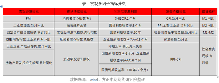 经过筛选后,我们最后选取了7大宏观因子指标,分别是PMI、Shibor:1M、国债10年-国债6个月到期收益率、M1与M2同比的剪刀差、社会融资规模:当月值、USDCNH:即期汇率(汇率)、PPI与CPI同比的剪刀差(通货膨胀)。