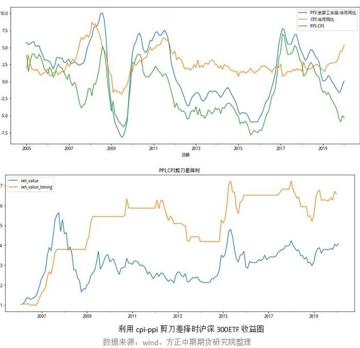 PPI下降可能是原料成本下降,但更可能是需求疲软所致。CPI主要有两部分构成一部分是不需要加工的农产品等,另一部分主要是工业品(PPI的部分产品)。如果PPI下降,但CPI上升说明农产品价格在上升,这对经济有通胀的压力。PPI的原料除了基础的石油,电力等还有初等产品,而CPI是上升的,就说明PPI的下降是由需求疲软导致。一般来说,在温和通胀下,企业生产的产品价格上涨,可提高利润率与投资意愿,有利于经济复苏。但是通胀超过一定的临界值时就要采取果断的紧缩政策或提高利率,否则人民购买力的降低将对宏观经济不利。因此若CPI过高时,股指大概率会下行,因此这块我们选择cpi大于5时,直接卖出指数,择时技术采取当PPI-CPI的三月均线下行时买入指数;当PPI-CPI的三月均线上行时卖出指数。