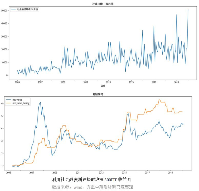 社会融资相对于新增贷款量是更广义的货币流通量统计指标,社会融资总量除了包含金融机构新增贷款外,还进一步纳入股票、债券融资等,使货币流量统计延伸到股市和债市等渠道的融资来源,从而更加真实地反映社会经济资金的供求状况。社会融资总量与经济增长存在明显的相互作用、相互影响的关系。国内信用类宏观指标,具备明显的非平滑性与季节性。(原因是国内银行通常为了季度信贷考核,将平常季中的信贷匀至季度末发放;使得部分月份的信贷冲量数据不稳定。)因此,在信贷类数据上按三月平均进行处理。当社会融资规模的三月均线上行时买入指数;当社会融资规模:当月值的三月均线上行时卖出指数。