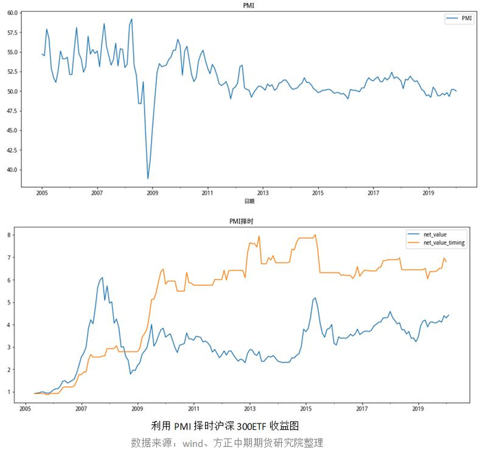 回测参数及择时技术:选择沪深300ETF股指期货为标的物,虽然2005年时300ETF还未上市,但为了观察宏观因子数据对股指ETF更全面的影响,我们以沪深300指数替代。仍选取测试时间从2005年1月1日开始至2020年2月25日截止,考虑到宏观指标多是月度发布,回测频率以月度数据为主,我们将在每个月月末对宏观指标进行处理得到开平仓信号。对于不同的宏观指标需要不同的择时技术,以PMI为例,我们一般会选取3月的移动平均线来进行择时,如果MA3当期大于上一期,则进行做多,否则进行做空。当然具体的择时技术是需要对单因子宏观指标进行不断测试然后优选才能得到,有些宏观指标可能适用于MA均线法,有些利率指标则需要通过布林带技术,对于这一块的测试,我们也是反复验证单个指标对股指收益率预测效果才能得到。
